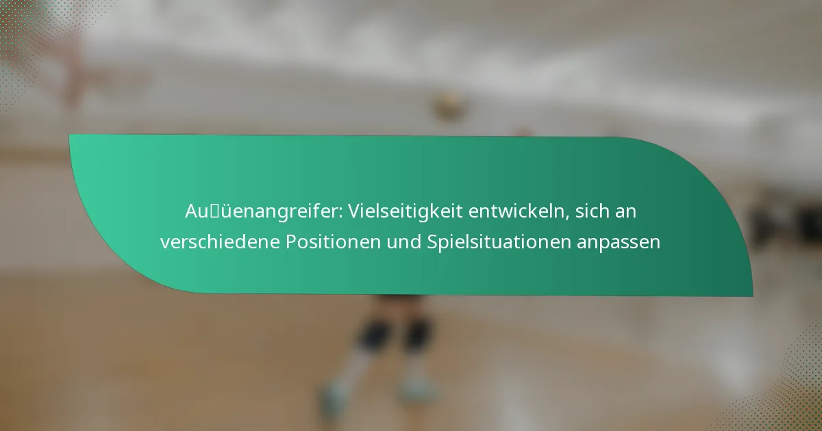 Außenangreifer können ihre Anpassungsfähigkeit durch eine Vielzahl von Übungen verbessern, die sich auf Vielseitigkeit in Spielstilen, positionsspezifische Fähigkeiten und Simulationen von Spielsituationen konzentrieren. Diese Übungen verbessern die Fußarbeit, Kommunikation und Reaktionszeit, sodass die Spieler sich während der Spiele effektiv anpassen können.